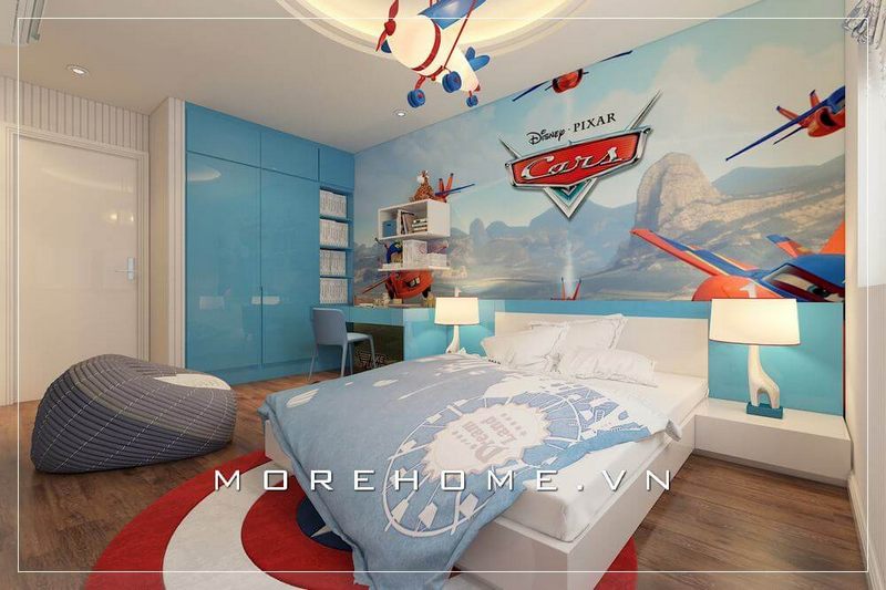Phòng ngủ của bé trai được trang bị nội thất đầy ấn tượng, giường ngủ được bố trí gần bàn học giúp cho bé có không gian nghỉ ngơi và học tập thoải mái nhất.