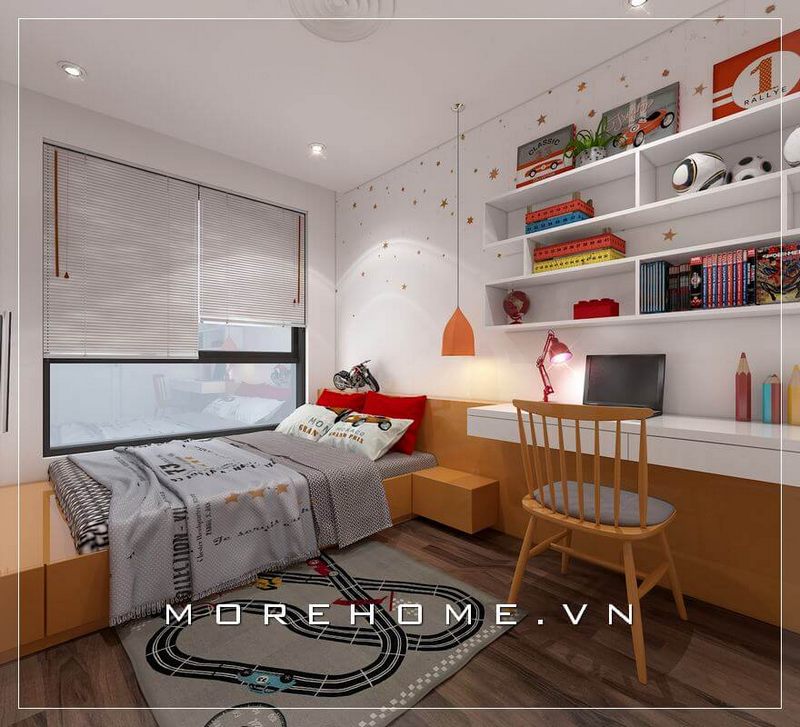 Mẫu thiết kế nội thất phòng ngủ con có diện tích nhỏ, phong cách hiện đại bao gồm một chiếc giường ngủ gỗ công nghiệp màu vàng gỗ liền mạch với tap đầu giường, một bàn học, tạo nên sự thống nhất cho cả không gian.