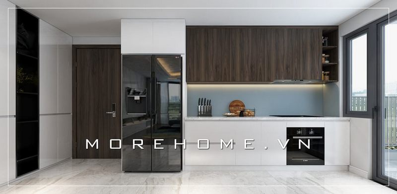 Việc chọn những gam màu như trắng, pastel hay các sắc thái nhẹ nhàng sẽ giúp ánh sáng phản chiếu và làm cho căn bếp của bạn trở nên thoáng đãng. Bên cạnh đó, việc kết hợp các vật liệu như gương hay kính trong thiết kế tủ bếp cũng góp phần tạo hiệu ứng không gian vô cùng ấn tượng.