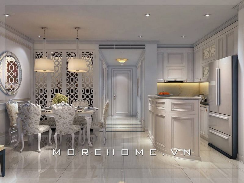 Ngoài ra, màu sắc cũng đóng vai trò quan trọng trong thiết kế nội thất phòng bếp. Việc chọn lựa những tông màu sáng như trắng, be hoặc pastel không chỉ làm nổi bật không gian mà còn giúp phản chiếu ánh sáng, khiến phòng bếp trở nên rộng rãi hơn. Thay vì sử dụng mặt bàn lớn, bạn có thể cân nhắc đến một bàn ăn nhỏ gọn tích hợp đa chức năng, vừa phục vụ nấu nướng, vừa là nơi thưởng thức bữa ăn, mang lại sự tiện lợi và phong cách hiện đại cho không gian sống của bạn.